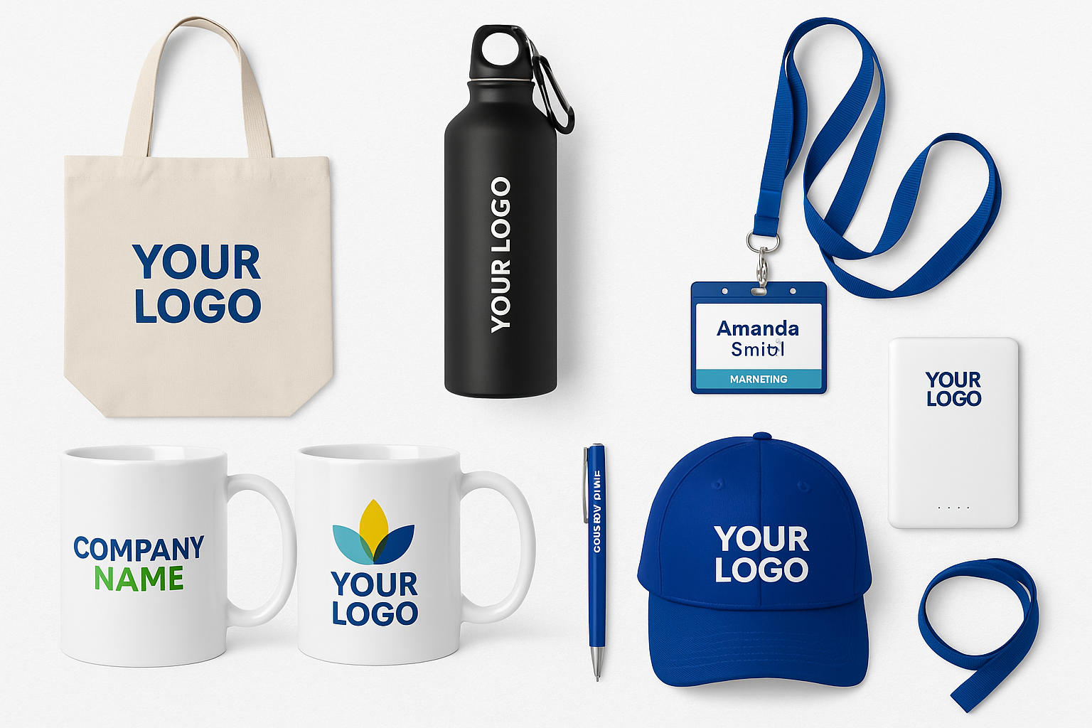 Variedad de productos promocionales distribuyendo marcas reconocidas.